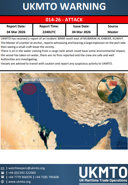 BREAKING: An oil tanker has been hit by a "large explosion" in the waters off of Kuwait, resulting in a large oil spill.